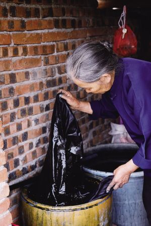 黃奶奶帶我去看她染布的地方,屋頂一間小小的屋子里擺了三個大缸,還沒走近就聞到濃烈的藍靛發(fā)酵所產(chǎn)生的獨特氣味。染缸用厚厚的布蓋著,如同黃奶奶的秘密寶箱,要掀開才能看到里面深色的液體?!敖裉觳怀桑麓稳静冀o你看?!彼戳丝匆后w表面,也沒多說,似乎染缸有它自己的節(jié)奏。