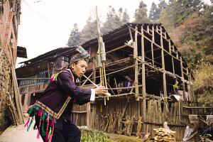 在侗族人口占78%的湖南省通道縣的牙屯堡鎮(zhèn),我們原本準(zhǔn)備尋找會織侗錦的姑娘,卻在風(fēng)雨橋上被一陣聲響吸引住了,便問當(dāng)?shù)厝耍骸斑@是何聲?制樂者何人?”原來,此聲為蘆笙所發(fā),制蘆笙者為楊枝光。他制作的侗族蘆笙,因手藝出眾,在湘黔桂的侗族村寨頗有名氣。2008年6月,侗族蘆笙被列入國家級非物質(zhì)文化遺產(chǎn)名錄,楊枝光榮幸地成為侗族蘆笙制作唯一的國家級“非遺”傳承人。