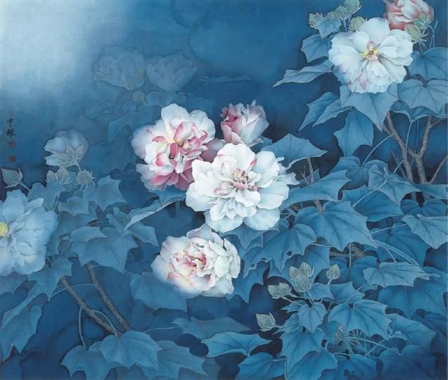 原作是畫家張玉明的工筆畫作品。一對孔雀棲息于爛漫盛開的山茶花間顧盼回首,相映成趣。整體繡面繡工精細、絲光迥動,將蘇繡精、細、雅、潔的特點表現(xiàn)得淋漓盡致。