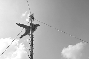 眾目睽睽下,徒弟們不敢丟臉,雖然內(nèi)心恐懼,但只能強(qiáng)裝鎮(zhèn)定。符長(zhǎng)洪的兒子、大徒弟符振德,慢慢地沿著刀梯挪向梯沿。他用手使勁攥住梯沿,單腳慢慢地踩上刀刃,試了試,安全,就將另一只腳也放上去。不一會(huì)兒,符振德順利地走下了刀梯。腳一沾地,他便樂開了花:“我成功了!”其他幾個(gè)徒弟也效仿符振德的做法,第一次完成了“上刀梯”的表演。