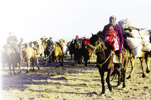 那是一支浩浩蕩蕩的隊(duì)伍,每戶人家的家就在那三四頭駱駝的背上,駱駝的先后排列也是有講究的
