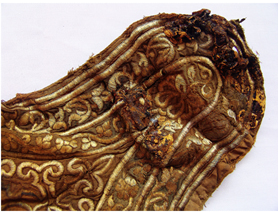 我們?cè)?jīng)描述過(guò)元代納石失生產(chǎn)的空前絕后。蒙古民族把對(duì)于黃金的寶愛(ài),傾泄進(jìn)元朝一百年的歷史時(shí)空。在整個(gè)13世紀(jì)的每一個(gè)歷史篇章,都鐫刻著納石失的金縷光影。我們?cè)谑妨侠锟吹?,天子之衣是納石失,天子之裳是納石失,天子之履依然是納石失。那么,蒙元一代,還有什么是用黃金絲線耗盡心血織繡而成的呢?現(xiàn)在,我們看到了這只金繡弓囊。