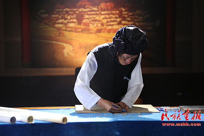 云南省級“非遺”傳承人、馬關壯族農民版畫師盧正林在制作版畫