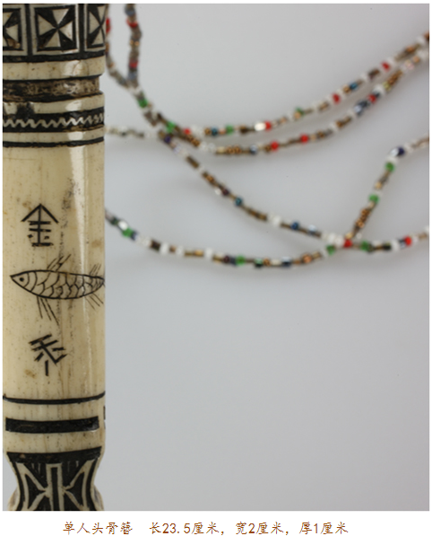 骨簪頭部以下是充滿幾何感的水波紋、山形紋、米字紋、圓形紋,留白之處有魚紋、花紋以及少許文字。文字或是雕刻者本人,或是其心愛之人。一般頭像處或中部系有幾束彩色料珠的紅纓穗飾物用以盤繞發(fā)髻上,或是以銀鈴、銀片來裝飾。