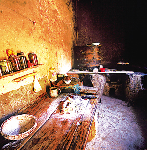 居室內(nèi)紅箱、畫柜耀人奪目,墻上掛有阿拉伯文字的對聯(lián)。屋檐下的臺(tái)階上,始終放著一個(gè)隨時(shí)洗手洗臉用的“湯瓶”,既節(jié)約又清潔。東西偏屋為晚輩居住,南邊為牲畜和草料房。東鄉(xiāng)人認(rèn)為家居四方平正,財(cái)源廣,子孫榮,門庭興旺。廚房是獨(dú)立的,砌鍋灶,有大案板,方便以面食為主的飲食習(xí)慣。