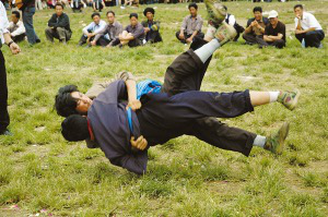 迎親宴畢,一般都要舉行摔跤比賽。先由女方家派人用酒邀請,接親隊(duì)伍應(yīng)邀派出選手。在比賽中,只有把對方摔倒在地才算贏,如果雙方同時(shí)倒地,則比賽無效。