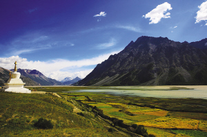 我們沿著湖畔徜徉,不經(jīng)意間步入了一片牧場(chǎng),只見一群牦牛在吃草,遠(yuǎn)處的崗日嘎布雪山神奇而壯麗。雪山的冰雪融水構(gòu)成了然烏湖主要的補(bǔ)給水源,然烏湖向西蜿蜒十余千米逐漸收縮成一道河谷,旁邊有一處藏族的小村莊,美得好像世外桃源一般,這就是傳說中的瓦巴村。村民們依湖而居,湖邊的平地是他們的牧場(chǎng)和田埂。散落在這里的幾戶人家,屋旁都插著顏色各異的經(jīng)幡,隨風(fēng)陣陣擺動(dòng)。