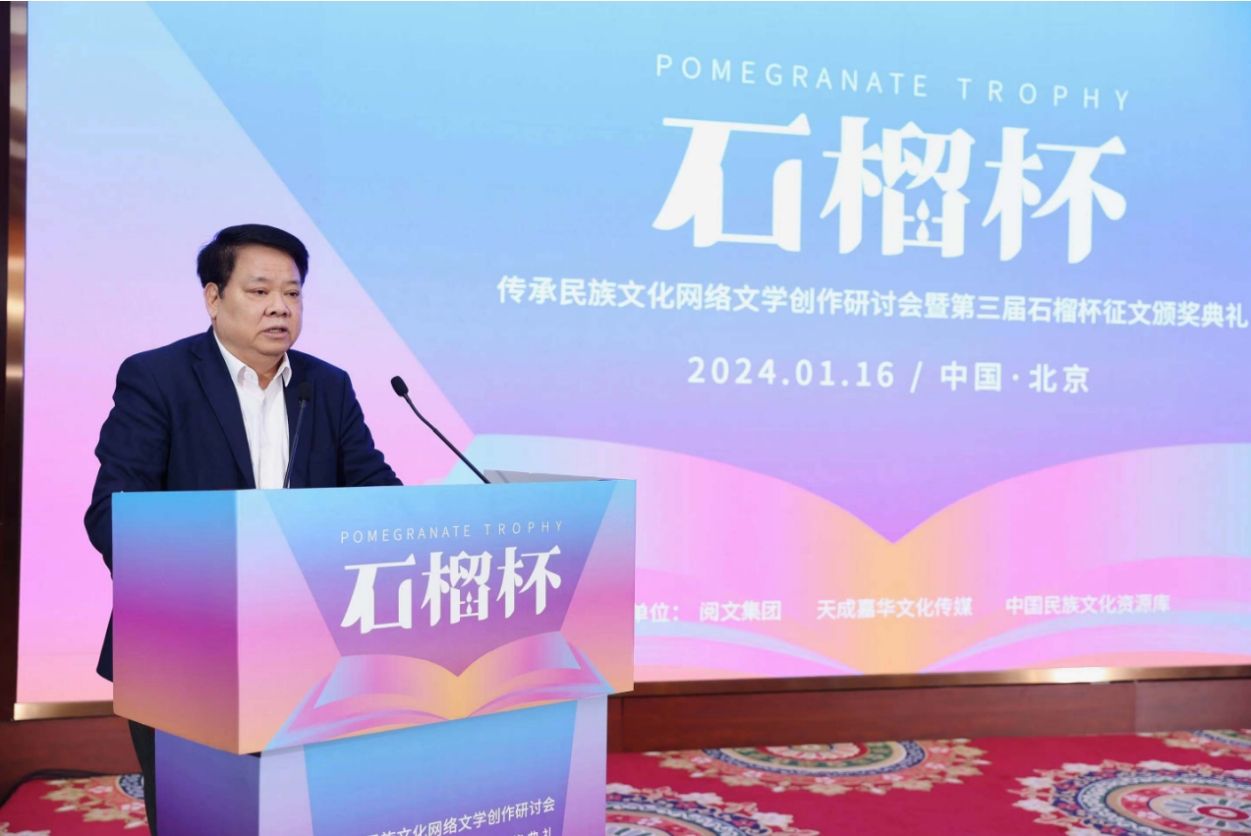 1月16日,由閱文集團(tuán)、北京天成嘉華文化傳媒主辦的“傳承民族文化網(wǎng)絡(luò)文學(xué)創(chuàng)作研討會暨第三屆石榴杯征文頒獎典禮”在北京民族文化宮舉行?;顒迂瀼貒颐裎椭袊鲄f(xié)聯(lián)合發(fā)出的《關(guān)于以鑄牢中華民族共同體意識為主線推動新時代民族文學(xué)事業(yè)高質(zhì)量發(fā)展的意見》的精神,旨在突出民族團(tuán)結(jié)主題,鼓勵民族題材創(chuàng)作,挖掘具有市場開發(fā)潛力的網(wǎng)文作品,推動“民族 IP”轉(zhuǎn)化。