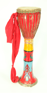 阿昌族的樂器主要有竹琴、洞簫、葫蘆簫(右圖,劉軍攝)、三月簫、銅口弦、三弦、象腳鼓(下圖,蒙哥提供)、铓鑼等。葫蘆簫是用葫蘆連接三根竹管制成的,它有7個音,音量小,音調低緩圓潤,一般晚上用。三月簫用一根竹管制成,也有7個音,它的音量大,音色細亮,多在白天使用。葫蘆簫和三月簫不僅是阿昌族人民心愛的傳統(tǒng)樂器,還是男女青年傳情示愛的媒介。