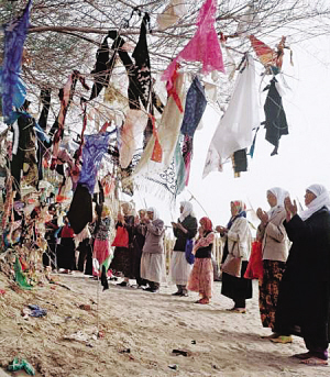 在新疆,尤其是在維吾爾族聚居的南疆,普遍存在類似內(nèi)地廟會式的麻扎朝拜活動。朝拜者面向麻扎傾訴心中的哀怨痛苦,以各種方式表達(dá)自己的祈求:有向麻扎求消災(zāi)避禍的,有求富貴發(fā)財(cái)?shù)模€有求夫妻和睦的,求理想伴侶的,求生兒育女的,求老有所養(yǎng)的,求天降甘霖的……