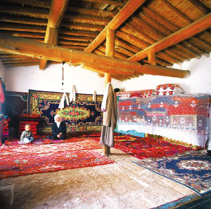 土房的室內(nèi)除有的搭火炕外,其它的裝飾和木房的一樣。到了采收紅花的季節(jié),鮮紅欲滴的紅花曬滿了院子,形成獨(dú)特的風(fēng)景。不論哪個(gè)房間,都可作為臥室,也用于待客,廚房和儲(chǔ)藏室單建,有的還單建馕坑。