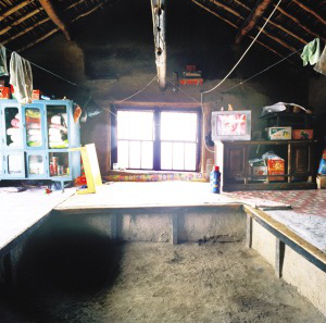 達斡爾族住房以兩間或三間居多,以西屋為上,不設(shè)北窗。東西兩屋的南面各有3扇窗戶,中間一間在房門兩側(cè)各有一扇窗戶,西屋開兩扇西窗,更利于采光和通風(fēng),這在北方民居中比較少見。兩間房的西屋是起居室,南、西、北三面連炕,成“凹”字形,與滿族的“萬字炕”差不多。近些年,達斡爾族家庭人口少了,特別是結(jié)婚的新房只搭北炕,南面放置組合家具和冰箱、洗衣機。東屋開南門,作為廚房,砌鍋灶,一般用8印或10印的鐵鍋。煙囪在墻外,與房頂有距離,有的用草垡子壘砌,有的用木板,這樣的煙囪不僅抽力大,灶堂好燒,而且可以避免草房頂?shù)幕馂?zāi)。近十幾年建的房子,煙囪都在西山墻上用磚壘砌,一直伸出屋脊后坡,高出房頂一米多。