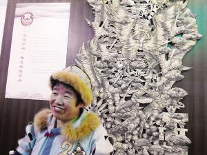 在展廳里,幾位來(lái)自黑龍江的手工藝人還現(xiàn)場(chǎng)展示了魚(yú)皮制作技藝。64歲的劉升從事魚(yú)皮制作已近20年,被評(píng)為黑龍江省工藝美術(shù)大師。她告訴記者,赫哲族過(guò)去主要用魚(yú)皮制作衣服,現(xiàn)在則用魚(yú)皮制作各種工藝品、小掛飾。在她身后,掛著一張長(zhǎng)兩米多、寬約1.5米的魚(yú)皮畫(huà)《還魂薩滿(mǎn)》,展示了赫哲族神話(huà)傳說(shuō)中的圖景,有薩滿(mǎn)、有森林、大鳥(niǎo)和各種圖騰,充滿(mǎn)了原始而神秘的氣息。劉升說(shuō),這還只是未完成的作品,但已用了3000多張大馬哈魚(yú)皮。