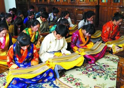 西藏藏醫(yī)學(xué)院的學(xué)生正在研讀記載著藏醫(yī)藥浴法相關(guān)知識(shí)的《四部醫(yī)典》。劉罡 攝