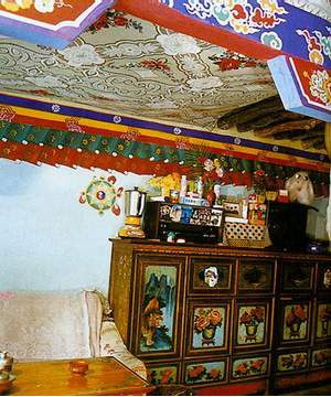 藏族民居室內(nèi)裝飾講究工整、華麗、亮堂,上至天花板下至與地板相接的墻角都采用雕刻、彩繪等藝術(shù)手段加以裝點(diǎn),尤其是橫梁、柱頭和大門(mén)等木結(jié)構(gòu)空間是充分展示裝飾才能的地方,在這里裝飾效果盡其所能。此外寺廟重點(diǎn)佛堂,回廊墻壁上繪制彩畫(huà),這也是一種重要的裝飾手段,而百姓居室內(nèi)的墻壁上用繪制花卉、彩條來(lái)取得裝飾效果。