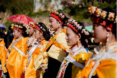 盤好發(fā)髻,佩戴好頭飾,在肩、背系好五彩哈達(dá)后,由本村具有威望的女性長者引領(lǐng)來到儀式現(xiàn)場。法號聲中,煨桑的青煙裊裊升起,威嚴(yán)的活佛主持誦經(jīng)祈福儀式。隨后,德高望重的長者為參加儀式的女子送祝福茶,長輩為姑娘們獻(xiàn)哈達(dá)。一系列儀式結(jié)束后,無論男女老少,都來到場地中央,踏歌起舞,跳起吉祥的鍋莊。