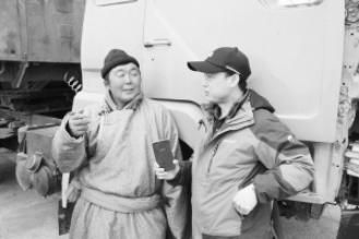 2017年,王玉龍(右)在內(nèi)蒙古二連浩特采訪蒙古國(guó)卡車(chē)司機(jī)。 受訪者供圖
