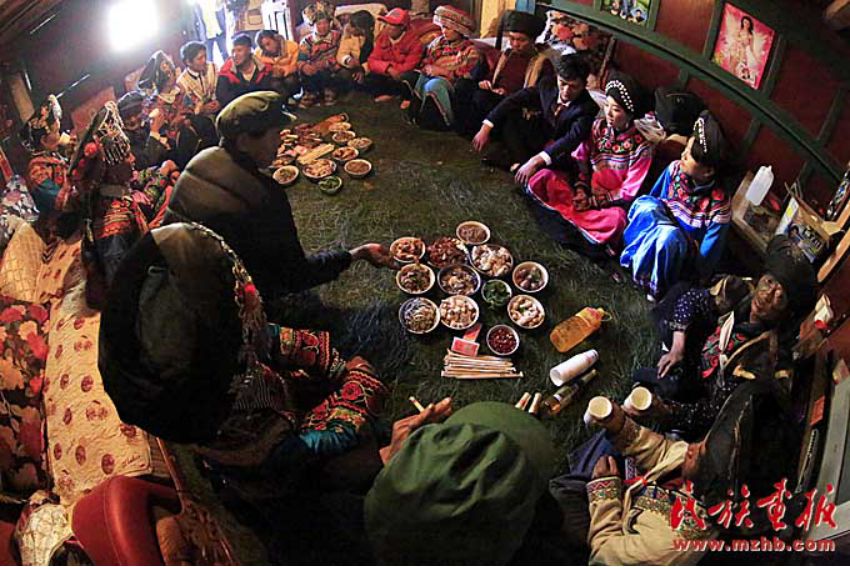 穿長衫,戴著包頭的新郎,把新娘接入正堂屋,將送親的人群迎進臨時搭建的青棚屋休息。青棚,是傈僳族人辦婚事時砍來毛櫟樹、香樹枝等臨時搭起的棚子。既清新又涼爽舒適。可以用來接待賓客,也可以作為跳舞、唱曲子的活動場所。晚餐就在青棚里進行,宴席一般不用桌子,酒菜擺在青棚下面鋪好青松毛的地上,客人八個一圈,席地坐在青松毛上,圍著喜筵,既歡樂又開心的喝著美酒、品嘗佳肴。晚飯菜肴十分豐盛,足見主人家的好客和廚師的高超手藝。菜出雙不出單,菜的顏色出紅不出白。一切都象征著成雙成對,吉祥如意。