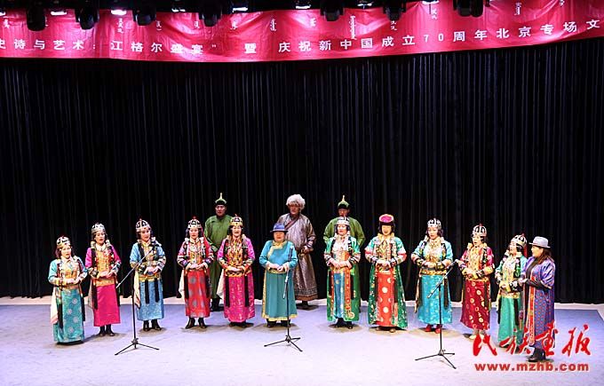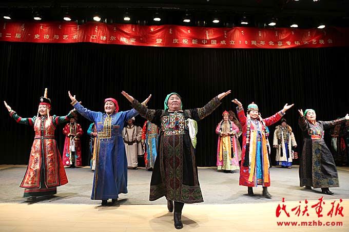 2019年11月11日,第二屆“史詩與藝術(shù):江格爾盛宴(論壇)”暨慶祝新中國成立70周年北京專場文藝晚會在北京民族文化交流中心魚與劇場舉行。晚會分為新疆蒙古族服飾表演、民歌、史詩、民俗表演4個單元,來自新疆阿勒泰、塔城、博爾塔拉、巴音郭楞等地州的105名民間藝人為首都觀眾獻(xiàn)上了一場原生態(tài)視聽盛宴。