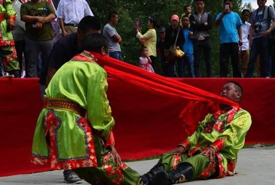 頸力賽和扳棍一樣,也是達斡爾族傳統(tǒng)的競技項目之一,在達斡爾族之間十分流行。頸力賽的比賽方式和扳棍相似,比賽雙方需要端坐在平地上,蹬直雙腿,腳掌相對,雙手叉腰或放在腿上,用布腰帶套在雙方脖頸后部。當裁判員聲響后,比賽雙方需要互相用脖頸力拉扯對方,哪一方被拉起或屈膝歪倒,就輸?shù)袅吮荣悺?/p>