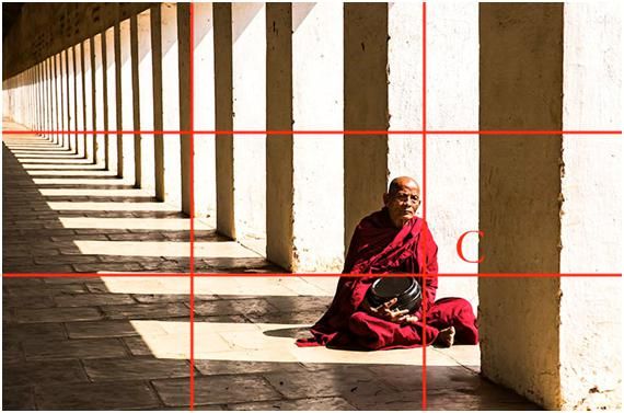 這三張圖都是就是黃金交叉點(diǎn)構(gòu)圖的應(yīng)用,第三張是在緬甸的拍的,當(dāng)時(shí)這個(gè)僧人坐在有光的長(zhǎng)廊里,他的頭不在交叉點(diǎn)上,但落在相對(duì)差不多的位置。
