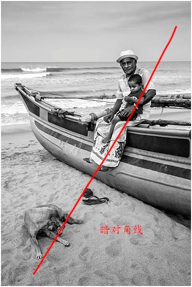 這個(gè)海邊老人跟狗之間也形成了暗對(duì)角線,包括下面的這個(gè)在拍照的人跟這個(gè)雕塑之間也形成了一個(gè)暗對(duì)角線,所以這個(gè)畫(huà)面非常平衡,不是一邊重一邊輕,而且不呆板。所以對(duì)角線這種形式非常實(shí)用。