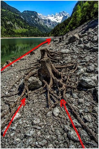 這個(gè)片子的興趣點(diǎn)是樹(shù)樁,樹(shù)樁根系和湖岸形成的引導(dǎo)線,把我們的目光從樹(shù)樁根系一直在往前推,一點(diǎn)點(diǎn)推到雪山,并不是跳躍性的看到雪山。觀者進(jìn)入畫(huà)面是一個(gè)逐步的過(guò)程,是一直有引導(dǎo)線引導(dǎo)著你,最后看向了遠(yuǎn)處的森林和雪山。