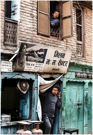 上面這兩張圖第一張,歸類為半包圍。第二張圖也是半包圍,在尼泊爾的一個(gè)小鎮(zhèn)拍的,旁邊兩個(gè)人是背影,實(shí)際上把這個(gè)人夾在中間,所以這個(gè)人特別容易引起你的注意,形成了一種包圍趨勢(shì),在電影的鏡頭語(yǔ)言中運(yùn)用的比較多。
