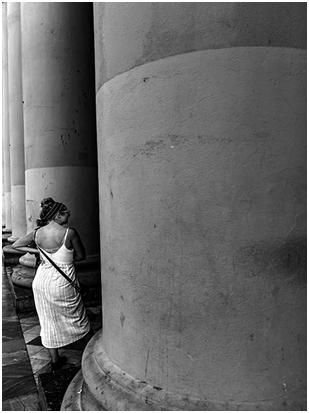 第一張圖也是在街上拍的,女人肯定在與柱子后面的人在交流,是什么樣的人?他們?cè)谧鍪裁??其?shí)都留給了觀者,這就屬于開(kāi)放式構(gòu)圖。
