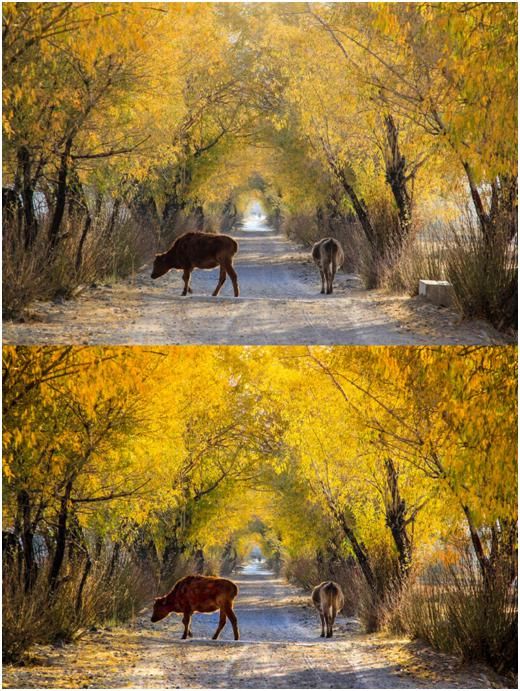 我們將遠(yuǎn)處部分的高光壓低,提亮了一下黃色的樹(shù)葉和地面的光照,加強(qiáng)了地面的陰影,這樣就有了一個(gè)比較通透明快的感覺(jué),空間的縱深效果也有了加強(qiáng)。另外也稍微提亮了牛身上的亮度,但不能提的太亮,因?yàn)檫@樣的話會(huì)使片子的噪點(diǎn)比較大,同時(shí)也會(huì)失色。