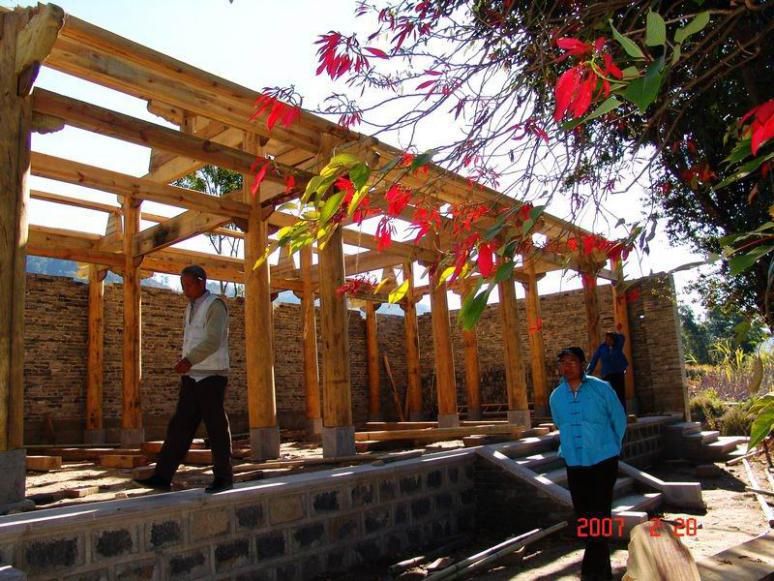 阿昌族建房傳統(tǒng)用工多是相互幫忙,全村協作,只吃飯而不付酬。建房一般分為“選材備料”“看風水擇房基”“動土奠基” “立柱成屋”等幾大程序。