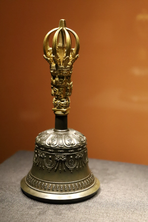 持驗(yàn)法器單元主要展示修持佛法、舉行佛事活動(dòng)和佛教儀式時(shí)所用的法器,包括金剛鈴、金剛杵、嘎巴拉碗、嘎巴拉鼓、嘎巴拉念珠、喀章嘎、金剛橛、鉞刀等。本部分所選法器多為藏傳佛教密宗修行所用,因多存于庫房,已不在原佛堂陳設(shè),其用途和使用場所便難以知悉。故宮中有許多佛堂,大多是乾隆時(shí)期建造,其中很多是密宗佛堂,如雨花閣、梵華樓、梵宗樓、養(yǎng)心殿西暖閣佛堂等。