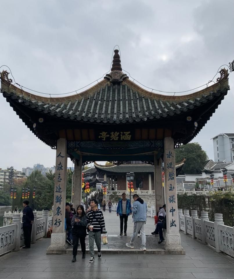 第二部分是甲秀樓。甲秀樓為三層三重檐四角攢尖頂穿斗式木結(jié)構(gòu)建筑,面闊三間,高約22.9米,紅欞雕窗,朱梁碧瓦,白石巨柱托檐,雕花石欄相護(hù)。甲秀樓歷來(lái)為文人墨客雅集之處,留下碑記、丹青、詩(shī)聯(lián)甚多,其中以清代田雯《重修甲秀樓碑記》、畫(huà)家鄒一桂《山水覌我圖冊(cè)—涵碧潭》、楹聯(lián)大家劉韞良《甲秀樓長(zhǎng)聯(lián)》最具代表。