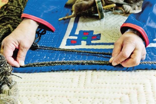 傳統(tǒng)氈繡不僅用于工藝品,大多用在生產(chǎn)生活中。蘇尼特氈繡技藝的繡制首先從制氈開始,大都在夏末秋初進行。材料多為駝絨線,而紡駝絨線則是用駱駝膝蓋絨毛以及駝鬣的細絨手搓而成。