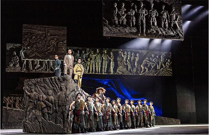 在舞蹈語言的設(shè)計(jì)上,編導(dǎo)融入當(dāng)代元素,使觀眾不但感受到審美的親切與現(xiàn)代感,而且還自然地進(jìn)入回望歷史的情境,對(duì)其思想內(nèi)涵的理解更為準(zhǔn)確。該劇的道具使用和調(diào)度也頗為大氣,令人印象深刻。一組斜坡狀的大型舞臺(tái)道具不但由群眾演員直接移動(dòng)而實(shí)現(xiàn)即時(shí)的場(chǎng)景調(diào)度,還可使演員上下和左右而行,最終組合成巨大的中國共產(chǎn)黨黨徽,輔助完成了人民英靈和英雄的形象塑造。