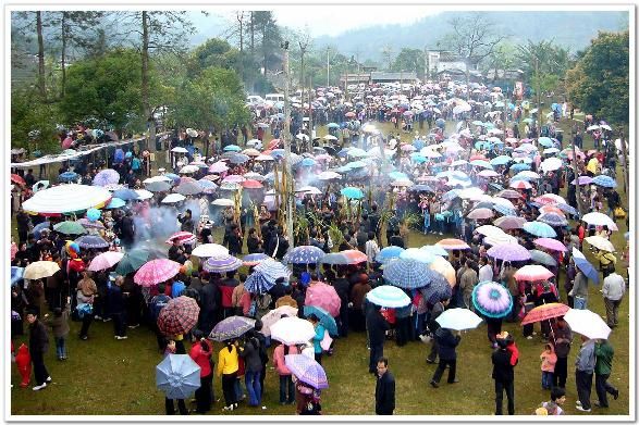 香粉古龍坡會于每年農(nóng)歷正月十六舉行,所以又名“十六”坡。這一天、來自外國朋友、各地的游客及當?shù)胤綀A十里的苗哥苗妹,提蘆笙,提鳥籠、牽馬匹,打花傘……朝著十六坡趕來。正午時分,山梁上、村道間、河溪旁,出現(xiàn)了成列成隊穿紅戴綠的人群。遠遠望去,似一條彩帶在飄動。當萬余人匯集后,整個坡地就成了彩色的世界。