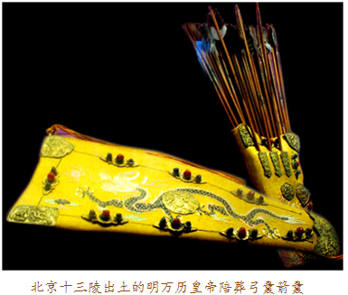 當弓囊出現(xiàn)在眼前時,我們應當想到它的另一半——箭囊。實事上,古代盛裝弓箭的器物被稱為櫜鞬(gāo jiàn),櫜盛箭,鞬裝弓,多以皮革制作。比如明十三陵出土的萬歷皇帝陪葬品櫜鞬,就用皮革縫制,外敷黃色素緞,金繡龍紋,鑲嵌金飾件及各色寶石。一般來說,弓囊為上寬下窄的袋形,箭囊則為長方形。在蒙古語中,弓囊與箭囊合稱為“撒答”。因為“答”與“袋”讀音相近,所以元代的漢族作家便在作品中將之寫為“撒袋”。這樣,“撒袋”一詞便入了漢語詞匯,特指裝弓盛箭的袋子。