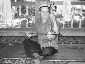 剛下車,就聽見平房里傳來了蒼涼、沙啞、如泣如訴的琴聲和悠揚的歌聲。這就是艾捷克的聲音嗎?簡直叫人心顫!我感嘆著,回頭問同行的翻譯薩達提·瓦依提。他仔細聽了聽,笑道:“這是艾捷克演奏的《青牡丹夏爾瓦努》!”“難怪這么深情婉轉(zhuǎn)?!蔽一腥淮笪?。