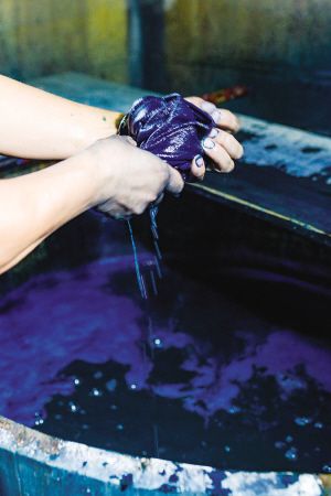 藍(lán)靛染布是一項古老的工藝,是白褲瑤服飾文化的重要組成部分。白褲瑤婦女用藍(lán)靛草來提取染布用的靛泥,隨時染藍(lán)、青棉線和青布。縫制衣物的白棉布用藍(lán)靛這種天然染料染色,其色澤與一般的機織布印染有所不同。2018年8月拍攝。