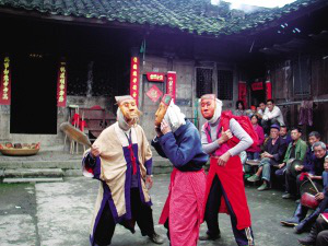土家族陽戲在貴州、湖南、重慶等省、市都有流傳,湖南省張家界陽戲和重慶酉陽陽戲均被列入了省級非物質(zhì)文化遺產(chǎn)名錄,得到保護(hù)和重視。貴州沿河土家族自治縣的土家族陽戲同樣古樸而充滿風(fēng)韻,5月19日,當(dāng)?shù)氐囊慌幕ぷ髡邤M通過挖掘整理,把獨具地方特色的面具陽戲申報為省級非物質(zhì)文化遺產(chǎn),希望沿河陽戲同樣受到重視和保護(hù)。