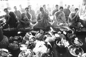 早晨8點多鐘,隨著緬寺大佛爺都比罕念誦起那古老的滴水詞經,賧奉儀式開始了。我隨玉波一家坐在從家里帶來的涼席上。緬寺里已擺放不下人們送來賧奉的物品,只好放在緬寺的周圍。人們用一根白線拴系著物品連著緬寺,以示并沒有遠離緬寺和佛祖。