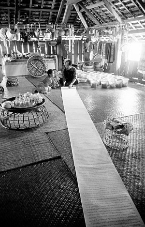 這時,走來一個大佛爺和兩個老人,因為佛祖不會開口說話,他們是來替佛祖給玉波念“薩拉帥”祝詞的。先由大佛爺念了一段《祝福經》,給玉波滴了水,然后兩個老人打開玉波那寬半尺、長足有7米多的“薩拉帥”祝詞。玉金說,這祝詞是請曼降村的前大佛爺康朗寫的(康朗:指佛爺還俗的人)。來倆個老人念,是考慮到可以換著念。玉波的奶奶也想到了玉波可能跪不習慣,就帶來了墊子,讓玉波或跪或坐,因為念完祝詞要兩三個小時。祝詞的內容大致是這樣的:“我是一個在菩提樹下長大的女孩,在佛祖的護蔭下,臉長得像菩提樹葉一樣又嫩又青,身材像檳榔樹一樣苗條好看,心像金鹿一樣善良。當我年滿12歲以后,人世間的喜樂情愛,貧窮苦難就會來到我的面前。今天在父母的幫助下,我準備了這些物品來賧給佛祖。我千祈禱萬祈求,希望佛祖保佑我織布是行家,丈夫種田是能手。命里見火能親,遇水能溶。生的孩子女的長得像一只蜜蜂,男的長得像一頭水牛,用他們的勤勞贍養(yǎng)雙親。從小就聽話,自幼就很乖。在母親的懷里不亂哭,在父親的背上不亂搓……”