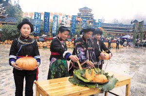 2012年10月28日,貴州省雷山縣達地水族鄉(xiāng)舉行“走進水鄉(xiāng)達地,體驗水鄉(xiāng)風情”建鄉(xiāng)20周年慶典暨水族“瓜年”活動?!肮夏辍鄙?,5000個大黃南瓜特別引人注目。大南瓜營造了濃濃的鄉(xiāng)情與年味,引得眾多參加節(jié)慶的鄉(xiāng)親、游客紛紛留影紀念。