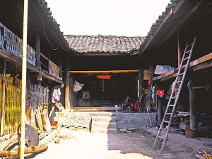廚房大都在左間,地中間橫砌土臺鍋灶,上面是兩口大鐵鍋??亢髩κ谴毒?、餐具,前面是石碓,平時搗豬飼料,節(jié)日搗粑粑,用石碓搗的辣椒面也格外好吃。右間大都是家長的居室,只放木床。兩側(cè)廂房與主房分離,木板梯上下。一側(cè)下層是豬圈、牛欄,上邊存干草;另一側(cè)下面堆放糧食、燒柴、摩托車,上層是未婚子女的臥室,有廊道、腰欄。院落小的,在主房對面設(shè)牛欄,砌土坯墻圍成獨立的合院。