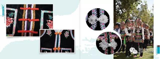 “羅羅潑支”男女服飾的特點(diǎn):“羅羅潑”男子服飾與“迷撒潑”相差無幾,一般不戴白頭巾。但是婦女的服飾相差卻很大,明顯保留著古樸高雅的南詔遺風(fēng)。頭飾由桂花、包頭、飄帶、大墜子、蜜蜂墜、芝麻鈴組成。桂花墊子在裱布上蒙黑色面料,中間訂有銀飾。包頭以黑色為主,長約2米,后鏈系于包頭,鏈子為銀制。飄帶長約4尺,黑色留花邊,兩頭訂英蘇。包頭還系有大墜子、蜜蜂墜各一對(duì),芝麻鈴20個(gè)。領(lǐng)合由裱布黑色面料上訂芝麻玲20個(gè)圍在脖子上。圍腰的前胸部,由領(lǐng)口至腹部,左右各垂掛一條綴有串珠、針筒、響篾(口弦)一類飾品和生活用品的銀質(zhì)項(xiàng)鏈。人一走動(dòng),全身的小蘇鈴就響,聲音悅耳動(dòng)聽,形象美觀大方。額頭前還圍有一塊翠綠色的“桂花綁”,綁上釘有銀質(zhì)小泡泡200多顆,羅羅潑支婦女的服飾彰顯華麗之美。