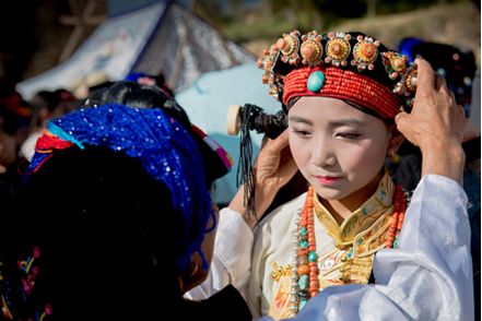 盤(pán)好發(fā)髻,佩戴好頭飾,在肩、背系好五彩哈達(dá)后,由本村具有威望的女性長(zhǎng)者引領(lǐng)來(lái)到儀式現(xiàn)場(chǎng)。法號(hào)聲中,煨桑的青煙裊裊升起,威嚴(yán)的活佛主持誦經(jīng)祈福儀式。隨后,德高望重的長(zhǎng)者為參加儀式的女子送祝福茶,長(zhǎng)輩為姑娘們獻(xiàn)哈達(dá)。一系列儀式結(jié)束后,無(wú)論男女老少,都來(lái)到場(chǎng)地中央,踏歌起舞,跳起吉祥的鍋莊。