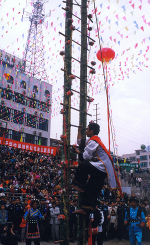 節(jié)日里,婦女們穿著鑲花邊的黑色上衣和點(diǎn)綴著各種銀飾物的花裙,佩戴耳環(huán)、項(xiàng)鏈等首飾,風(fēng)采奪人。男人穿著麻布短衣褲,腰系紅黃長(zhǎng)帶,小腿系吊簡(jiǎn),腰佩長(zhǎng)刀,肩挎箭包,英姿勃勃。節(jié)目的廣場(chǎng)上,堅(jiān)趄兩根二十米高的樹干,四周用藤蔓拉緊固定,樹桿上插有三十六把明晃晃的長(zhǎng)刀,作為向上攀登的橫檔,刀刃向上,寒光逼人,謂之“刀竿午間。鞭炮齊鳴,鑼鼓震天”。身穿大紅抱、頭纏紅布包頭、赤腳的五名“玩火者”,齊涌至竿下,圍繞刀竿唱歌跳舞,將斟滿的白酒一飲而盡,縱身飛上刀竿。雙手緊提刀面,運(yùn)足氣的腳掌斜置在鋒利的刀刃上,勇敢、靈巧地向上攀登。全場(chǎng)鴉雀無(wú)聲,大家屏住呼吸仰面觀看,對(duì)他們的氣功絕技贊嘆不已。噼噼啪啪的鞭炮聲來(lái)自竿頂優(yōu)勝者,響徹云霄。全場(chǎng)歡呼跳躍,爭(zhēng)相向爬桿者敬獻(xiàn)美酒。對(duì)歌、跳舞、蕩秋千活動(dòng)為節(jié)日增添了濃郁的氣氛。丟煙包(煙盒)活動(dòng)別具一格,青年男女各站一方,互擲煙包,姑娘將小伙的煙包收藏起來(lái),說(shuō)明姑娘接受了小伙子的愛(ài)慕。