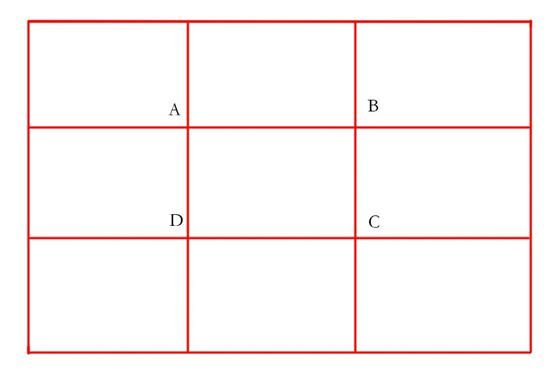 井字形構(gòu)圖和黃金分割法構(gòu)圖是什么意思呢?就是在拍攝的時候,拍攝主體也就是興趣點,根據(jù)現(xiàn)場的情況,放在這ABCD這四個位置上,這樣看起來畫面是比較舒服,是比較協(xié)調(diào)的,比如說你拍攝一個人,人頭應該是在交叉點上。