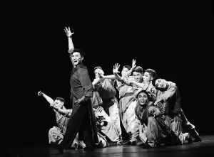 引子部分,板兒聲響,一個(gè)調(diào)皮的男孩偷跑出來聽書,他穿越人墻等待好戲開場(chǎng)。此時(shí),說書人突然開講,吸引越來越多的“觀眾”(舞者)紛紛上前,仔細(xì)聆聽接下來發(fā)生的離奇故事。第一段舞蹈以群舞的形式表現(xiàn)人潮逐漸聚集的場(chǎng)景,通過“側(cè)耳聽”和“左右看”這兩個(gè)動(dòng)作,反映出“觀眾”對(duì)于山東快書的好奇之心。