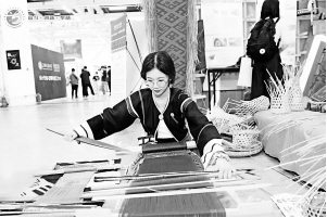 2021年5月,在第六屆全國大學(xué)生藝術(shù)展演活動(dòng)現(xiàn)場(chǎng),海南師范大學(xué)學(xué)生展示黎族腰織機(jī)織錦技藝。第六屆全國大學(xué)生藝術(shù)展演活動(dòng)組委會(huì)供圖